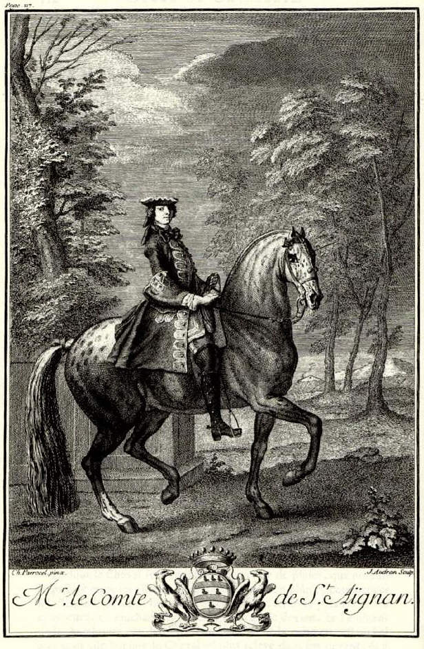 ![]() Dieser Junge Mann, der Comte de St.Aignan ist der älteste Sohn von Paul de Beauvilliers (1648-1714), Comte de Saint Aignan seit 1679 der aber in Paris wohnte und seit 1685 Präsident des Finanzrates war. Bedeutender war sein Amt als Erzieher des Herzogs von Burgund, einem Enkel von Ludwig dem 14. und Vater von Ludwig dem 15. Er war damit ein Insider der höchsten Kreise des französischen Hofes, zumal er eine Tochter von Colbert heiratete. Seine Freunde , die bedeutenden Philosofen und Literaten Fénelon und Saint-Simone schildern ihn als gebildeten und sehr angenehmen Menschen. Kein Wunder, dass Guérinière die beiden Söhne dieses einflußreichen Höflings in seinem Werk als seine Schüler herausstellt. Passage qu'on apelloit autrefois, Pasèdge, du mot italien, Spassegio, signifie promenade. C'est un pas ou on trot mesuré & cadencé. Il faut dans ce movement qu'on cheval tienne plus longtemps les jambes en l'air, l'une devant & l'autre derrière, croisèes & oposèes comme aux trot, mais il doit etre beaucoup plus racourci, plus soutenu , & plus écoutè que de trot ordinaire; en sorte qu'il n'y ait pas plus d'un pied de distance entre chaque pas, qu'il fait, c'est-a-dire, que le jambe qui est en l'air, se pose environ un pied au delà de celle qui est a terre. Die Passage, auch Passedge oder auf italienisch Passegio (Spaziergang) genannt, ist eine abgemessene, taktmäßige Gangart. Das Pferd muß dabei wie im Trab jeweils ein Vorder und ein Hinterbein diagonal (oder kreuzweise) längere Zeit in der Luft halten, jedoch weit mehr verlangsamt, ausgehaltener und schulmäßiger als im gewöhnlichen Trab, so dass es bei jedem Tritt nicht mehr als einen Schuh (ca.32cm) vortritt, das heißt, das sich in der Luft befindenen Bein fußt ungefähr einen Schuh vor dem auf der Erde stehenden. Auch dieses Bild beindruckt durch die Wiedergabe der perfekten Harmonie zwischen Reiter und Pferd. Es zeigt den Moment des tiefsten Punktes der Rückenschwingung, in dem der Reiter bei elastisch federndem Rücken den intensivsten Kontakt zum Pferde genießen kann. [ mehr] |