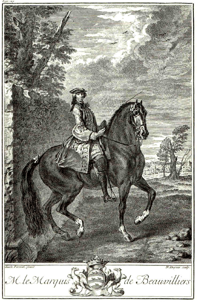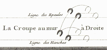 ![]() Wie das Wappen zeigt ist auch dieser junge Mann, der Marquis de Beauvilliers wie der Comte de St.Aignan ein Sohn von Paul de Beauvilliers (1648-1714), Comte de Saint Aignan, über den näheres auf der Seite le Passage zu finden ist. Croupe au mur Ceux qui mettent la tete d'un Cheval vis-à-vis du mur, pour lui aprendre à aler de coté, tombent dans un erreur, dont il est facile de faire voir l'abus. Cette méthode le fait plutot aler par routine que pour la main les jambes; & lorsqu'on l'ote de la muraille, & qu'on veut le ranger de coté dans le milieu du manège, n'ayant plus alors d'objet qui lui fixe la vue, il n'obéit qu'imperfaitement à la main & aux jambes, qui sont les seuls guides dont on doive se servir, pour conduire un Cheval dans toutes ses alures. Renvers Diejenigen, die ihre Pferde mit dem Kopf gegen die Wand stellen, um ihnen Seitengänge beizubringen, verfallen in einen Irrtum, dessen nachteiligen Folgen sich leicht zeigen lassen. Auf diese Weise gehen sie eher aus Routine als an der Hand und am Schenkel und wenn man sie von der Mauer weg in der Mitte der Reitbahn seitwärts gehen lassen möchte, haben sie keinen Blickfang und gehorchen nur unvollkommen der Hand und den Schenkeln, die doch die einzigen Hilfen sind, derer man sich bedienen darf um einPferd in allen Gangarten zu lenken. ![]() Anders als beim Schulterherein verlangt Guérinière beim Renvers sehr viel Abstellung. Der Reiter fasst zur Unterstützung der Rechtsbiegung mit der rechten Hand in den rechten Zügel und führt beidhändig. Guérinière empfielt das bei noch wenig gefestigten Pferden. |