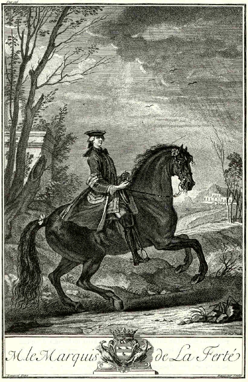 ![]() Der Marquis de la Ferté stammt seinem Wappen entsprechend ebenfalls aus der Familie de Beauvilliers. Unter den Rittern des Ordens von Saint Esprit gibt es einen Francois de Beauvilliers (1608-1687), comte, dann Duc de Saint-Aignan, Pair de France, Vicomte de Valognes, Baron de La Ferté. Er könnte aber auch der Enkel von Henri de la Ferté, duc de Senneterre (1600.1981) sein, der ein draufgängerischer Reiter-Oberst, später Marschal von Frankreich war. Ein Jean Charles de La Ferté, Marquis de Saint Nectaire "de Senectere" ( 1685-1771) wurde 1757 ebenfalls Marschall von Frankreich. Dem Alter nach könnte er das Modell für diesen Reiter abgegeben haben. Andere Quellen vermuten, dass er ein dritter Sohn von Paul de Beauvilliers ist. Auch auf diesen Schüler konnte Guérinière stolz sein. La Galopade ou le galop de manège est une Galop uni, bien ensemble, racoursi du devant & diligente des hanches; c'est-à-dire, qui ne traine pas le derrière, & qui produise par l'égalité des ressors du Cheval, cette belle cadence, qui charme autant les specteurs, qu'elle plait au Cavalier. Die Galopade oder der Schulgalopp ist ein gut versammelter Galop, im Vorwärts begrenzt und mit fleißigen Hanken, d.h.: ohne schleppende Hinterhand, der durch die Gleichförmigkeit der Sprünge eine schönen Rhythmus entstehen lässt, der sowohl den Betrachter bezaubert als er dem Reiter ein gutes Gefühl gibt. Auch dieses Bild zeigt ein perfekt proportioniertes, ausdrucksvolles Pferd in deutlichem Bergauf. Parocell gelingt es wieder beeindruckend, das Einswerden von Mensch und Kreatur dartzustellen. Der tief im Pferd sitzende Reiter greift gerade mit der rechten Hand in den rechten Zügel. Guérinière lässt dieses Abweichen von der einhändigen Zügelführung für kurzzeitige Korrekturen zu. |